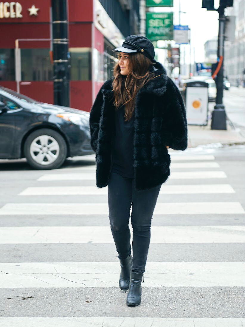 Wearing: Fur Coat (similar) | Jeans | Hat | Shoes (similar) | Sunglasses